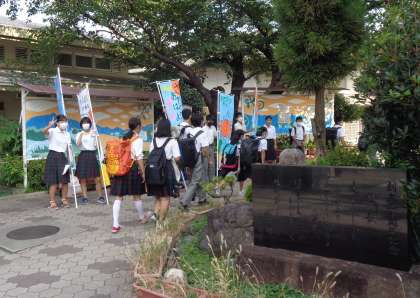 朝の校門で「おはようございます」と爽やかな挨拶が響いています。暑い日が続きますが、元気に過ごしましょう。