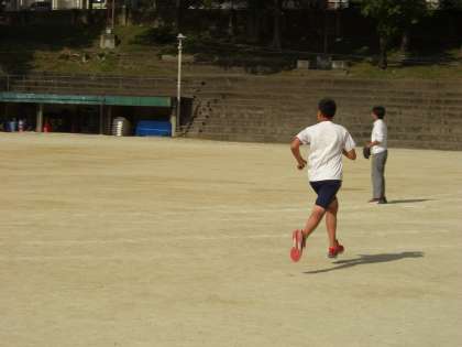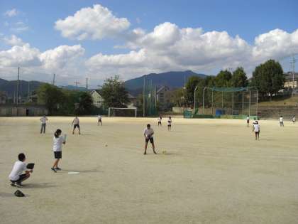 3年生は体育の授業。ソフトボールです。「ナイスバッティング!」