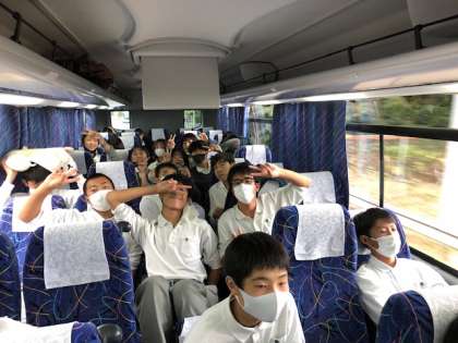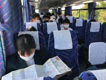 バスの中で班別研修のレクチャーを受けています。