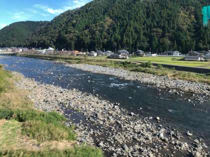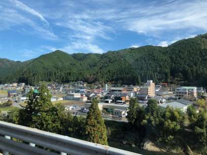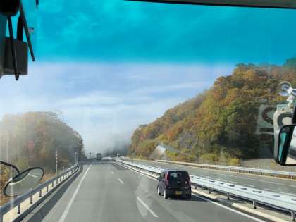 いよいよ美並インターを降り、郡上八幡です。山の紅葉もきれいです。高速道路では、日本最高地点になる標高1085mを抜けました。