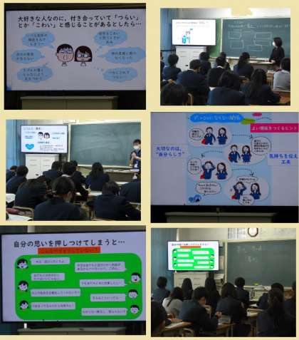 2年生は5限に「素敵な関係〜デートDVの予防〜」について学習しました。思春期は自己主張や自己顕示欲が強くなったり、色々なことに関心が高まり心が大きく揺れ動きます。自分自身も含めて一人一人の考え方等の違いを理解し、相手を思いやる気持ちを身につけ、対等な関係を築けるようになってほしいと思います。