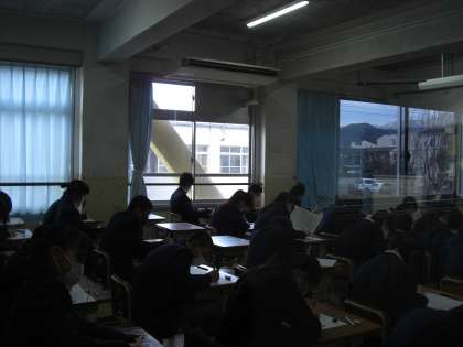 本日より、1・2年生は学年末テストが始まりました。静まりかえった教室からは、鉛筆の音だけが響いていました。明日と明後日の2日間に向けて、本日の午後も計画的に学習を進めてください。また、寒波到来により急に冷え込んでいます。体調管理も万全にしてテストに臨みましょう。