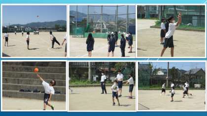 昨日から暖かくカラッとした天気です。グラウンドからも元気な声が聞こえてきました。1年生の体育の授業でハンドボール投げの様子です。8組は6月に予定されている合同球技大会のバレーボールの練習です。サーブの仕方は個人のよって,投入れや3m・6m・9mとネットからの距離を変えて行っています。