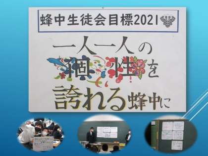 先輩方がこれまで築いてきてくださった蜂ヶ岡中学校という場所に新たな種をまき,その種が芽を出し,いきいきと伸びていくように,私たちが自ら考えいきいきとした学校生活を作っていける,そんなきっかけのある場所にしたいと思います。みなさんの心温まる意見をお待ちしています」