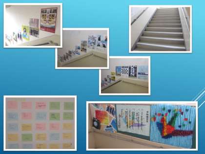 階段の壁には,4階までの公立・私立と分けて,たくさんの高校の案内ポスターも掲示されています。ポスターには学校説明会などの日程も書かれています。