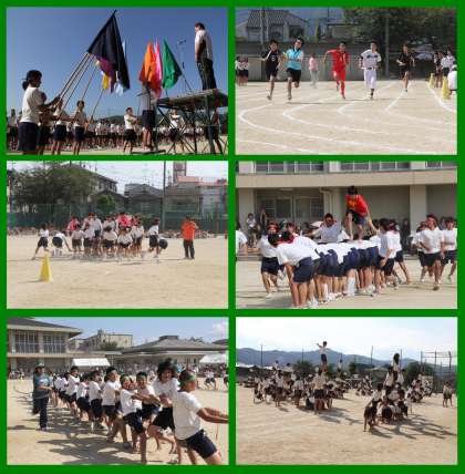 9月28日,秋晴れの下,第63回体育大会を実施しました。早朝より,多くの来賓,保護者,地域の方々の応援の下,生徒たちは「最後まで真剣に」競技に取り組みました。特に,みんなが互いに信頼し協力して行う「組体操」は,今年から全学年男女が取り組み,タワーやピラミッドなど迫力ある演技を披露しました。中学3年生にとっては,良い思い出となったことでしょう!