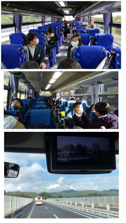 バスレクも盛り上がっているようです。現在バスは三原市を通過中。バスのモニターでは広島県の案内が流れています。修学旅行で訪れるご当地の歴史や文化をしっかりと吸収してきてくださいね!