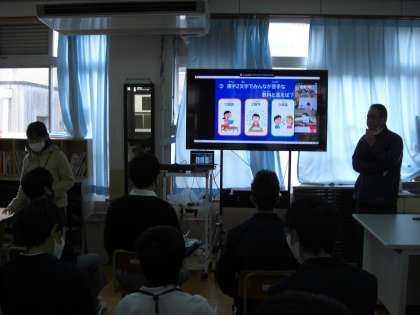 8組は支援学校との学校間交流をオンラインで行いました。例年であれば実際に顔を合わせて行っていましたが、コロナ禍のなかZOOMを利用しての実施となりました。自己紹介や学校紹介、クイズなどを通してお互いのことをたくさん知ることができました。来年度はオンラインではなく実際に集まって実施したいですね。