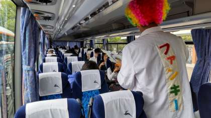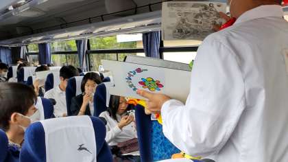 バス内で昼食をとりながら,SDGsプログラムのオリエンテーション