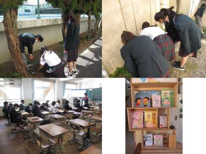 上2枚は、1年生理科の授業の様子です。何やら目的の植物を探して教室まで持ち帰るようです。○○を探していると教えてもらったんですが…。忘れてしまいました。皆さんはこんなことがないようにしっかり学んでください。