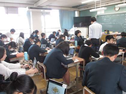 3年生の修学旅行の取組が本格的に始まりました。平和学習に加えて、「おみやげ」「世界遺産」「伝統・文化」など、28〜29のテーマを一人一つずつ割り当てて調べ学習が始まりました。GIGA端末を駆使し、まとめます。同じテーマの人は学年で6人。その中から1名が選ばれ冊子になるとか。「絶対選ばれるし!」との声もありました。沖縄音楽を聞きながら、気分はもう沖縄上陸です。出来上がりが楽しみです。