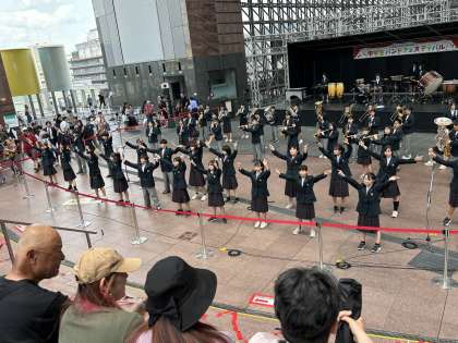 26日、京都駅ビル大階段広場で行われた「中学校バンドフェスティバル」に本校吹奏楽部が出演しました。海外からのお客さんもたくさん見られる中、英語でのMCを交えながら2、3年の演奏と1年のダンスを披露しました。部員たちの一生懸命な姿に、客席から大きな拍手と温かい声援を頂くことができました。