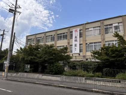 卒業生の高橋藍選手 パリ五輪出場を祝う懸垂幕を吊りました