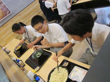 昼食はうどん屋に行きました。自分でお金の計算をして,メニューを選び,注文して,レジで支払いました。みんな緊張していましたが,ぺろりとおいしく平らげていました。