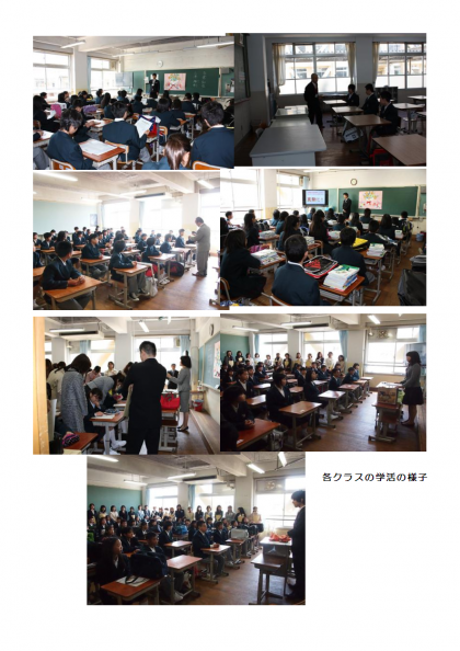 少し肌寒さを感じるなか、第65回の入学式が行われ、235名の新入生が入学しました。真新しい通学服を着て、少し緊張気味でしたが、クラス発表をみて笑顔もみられました。式では、校長より「学習や部活動などに積極的に取り組み、可能性をのばして欲しい」「お互いが困ったときに助け合える友達をたくさん作って欲しい」という内容の話がありました。生徒会代表からは、中学校生活の紹介とわかないことは聞いてくださいと、やさしい激励の言葉がありました。そして新入生代表の決意表明の後、各クラスに分かれて初めての学活が行われました。担任の先生から学校生活や明日以降の予定などを聞きました。いよいよ明日から中学校での生活が始まります。全員元気に登校して欲しいと思います。