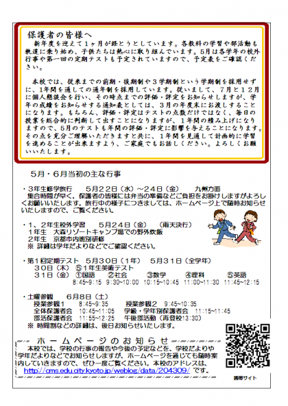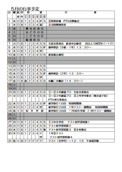 5月は各学年の校外行事や、初めての定期テストが予定されていますので、ご確認ください。