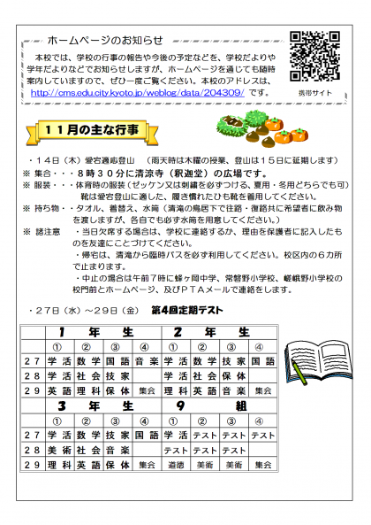 本日、学校だより11月号を配布しました。行事予定など、参考にしてください。