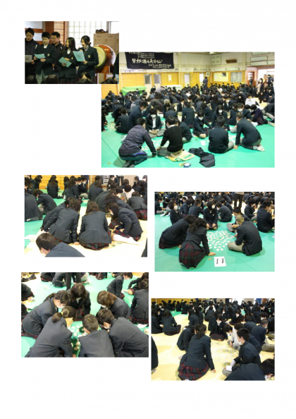 インフルエンザなどで欠席する人も少なくなった今日の午後、2年生の百人一首大会を行いました。全員にマスクを渡し、アルコールで消毒して新たに感染する人を出さないように心がけました。延期になっていた行事でもあり、楽しむことが出来ました。