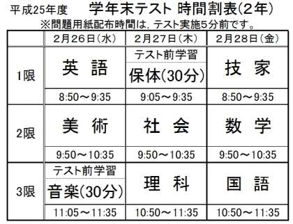 1・2年生の学年末テストが近づいてきました。一年間の学習のまとめとして、とても大切なテストです。また春からの新しい学年での学習にもつながります。普段のテストより範囲の広い教科もあると思いますので、計画を立ててしっかり取り組みましょう。