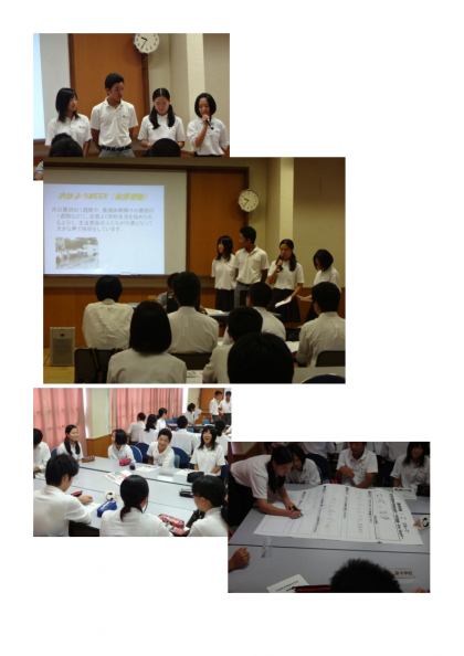 今日の午前中に四条中学で行われた、「右京支部中学校生徒会交流会」に、本校からも生徒会本部役員を含む4名が参加しました。最初に参加した11校から各校の生徒会活動について発表しました。その後、それを受けて右京区の中学校が共通して取り組める一つの取り組み『One Heart』を決定するために、グループごとの話し合いを行いました。その結果、共通して取り組む内容は、あいさつ運動に決まりました。これまでも多くの学校であいさつ運動に取り組んでいると思いますが、今回の決定を受けてより工夫された活動になることを期待しています。