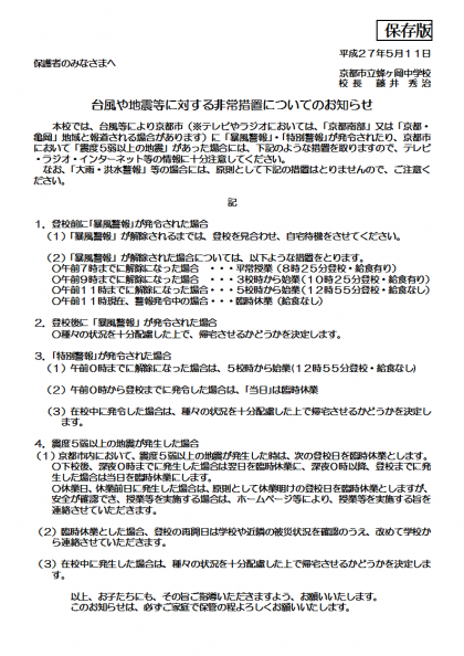 「台風や地震等に対する非常措置についてのお知らせ」を配布しました。家庭での保管をお願いいたします。