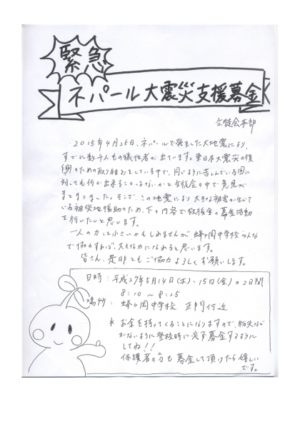 4月25日に発生したネパールの地震では、周辺国も含めて甚大な被害を出しています。子どもたちを含む非常にたくさんの犠牲者を出し、いまだに被害の全容がつかめていないとの報道もあります。そこで本校の生徒会本部役員で話し合った結果、5月14日と15日に本校の正門付近で緊急の募金活動を行うことになりました。趣旨に賛同していただける方は、ぜひご協力をお願いいたします。