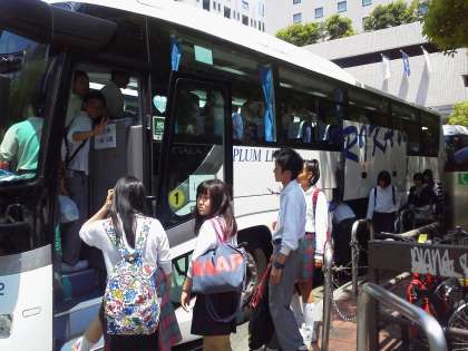 快晴のもと博多駅に到着しました。これからバスで牧島へ,ペーロン体験に向かいます。