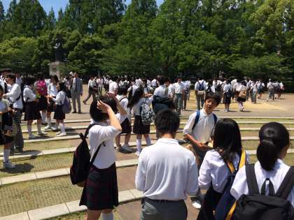語り部さんからの講話を聞いた後,事前学習を生かして資料館の見学を行いました。その後,爆心地へ移動し,みんなで平和を祈念してつくった千羽鶴を奉納しました。これから,いよいよ長崎班別研修のスタートです。各班が事前に計画した見学場所を経て,大浦天主堂に集合です。時間に遅れずに,計画通りに研修できる班はいくつあるでしょう!