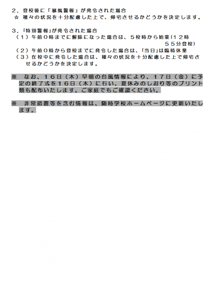 現在、台風11号が太平洋上を北上しています。本校では台風の接近にともない、17日(金)にかけて、暴風警報や特別警報が「京都南部」または「京都、亀岡」に発令された場合は、以下のような措置をとりますので、ご了承ください。なお、本プリントは本日全校生徒に配布しました。