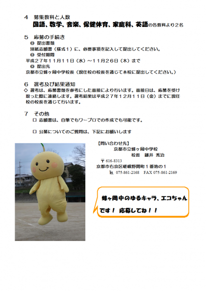 蜂ヶ岡中学校では、来年度の人事異動に向けて教員の公募を行います。本校の教育方針に賛同していただける方の応募をお待ちしています。