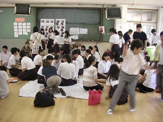 お昼休みの時間にご近所・児童館から9組の赤ちゃんとお母さんを中学校にお招きして、中学生が赤ちゃんと遊びました。赤ちゃんのお母さんから話を聞いたり、赤ちゃんを抱かせてもらいました。周りから「おかあさん」と呼ばれている生徒もいました。