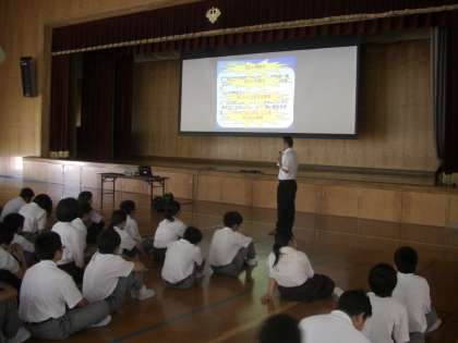 教育委員会より先生を招いて、1年生対象に世の中で起こっている様々なトラブルについてお話をいただきました。いじめに関することやインターネット関係の話題が心に残りました。気をつけて夏休みをむかえたいと思います。