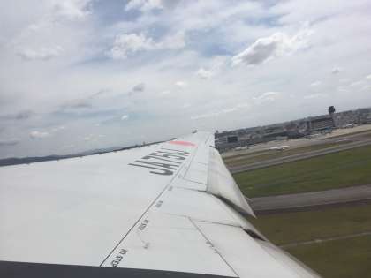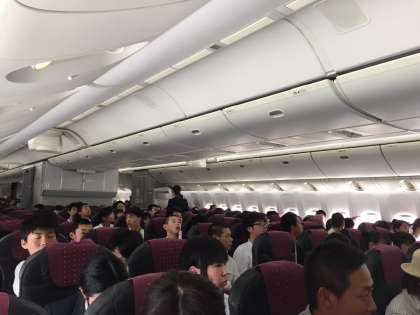 天候不良のため,1時間遅れで那覇空港に到着しました。少し疲れたようですが,みんな元気です。