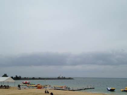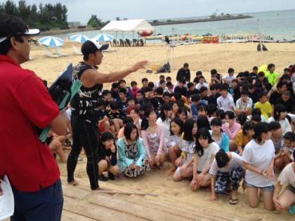 いよいよマリン体験が始まります。説明を受け,怪我のないように楽しんで下さい。天候はどんよりした曇りのようです。晴れたら良いのですが,昨日の雨よりはましですね。