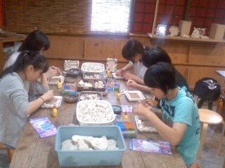 琉球村での文化体験がすすんでいるようです。シーサーつくりやタオルプリントに取り組んでいます。