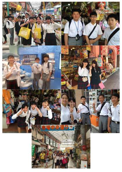 国際通りでの班別研修の様子です。約1.6kmにお土産屋や三線楽器店,飲食店などが建ち並んでいる賑やかな通りです。沖縄戦後の焼け野原から急速な発展を遂げたこともあり,通称「奇跡の1マイル」とも呼ばれます。