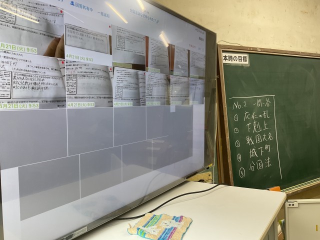 社会の授業では、ロイロノートを使ってクラスみんなの意見を交流するという