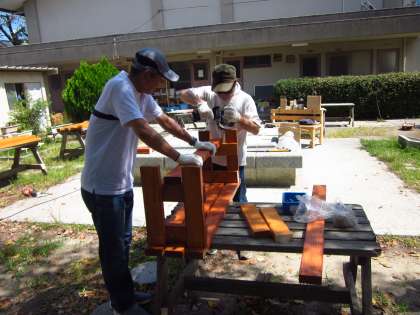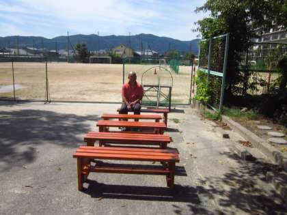 9月9日、朝からPTAさんがいこいの広場の机いすを使いやすくするため、