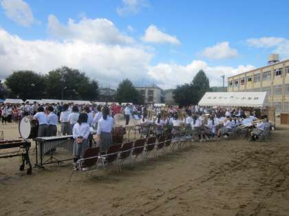 台風が去って、青い空の下、吹奏楽部がオープニングに演奏をしました。