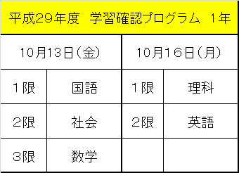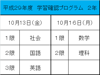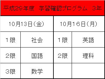 13日(金)・16日(月)と2日間に渡って、学習確認プログラムテストが行われます。3年生にとっては、最後の学プロテストであり、自分の実力を見極めるテストでもあります。しっかり対策をとって臨みましょう。