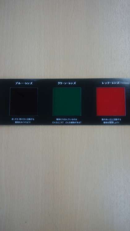 赤のレンズでのぞくと、昼間の野生動物のようすがみられるよ。