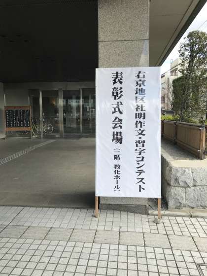 12月2日(土)花園会館で“社会を明るくする運動”第14回右京地区作文・習字コンテスト表彰式が執り行われました。本校からも1年生のIさんとAさんが入賞し,表彰されました。「社会を明るくしていくためにどうすればいいか」を夏休みの期間に考えてもらい,「犯罪を犯してしまった人へのサポートについて」や「学校と社会のつながり」という内容で表現していました。日々,「自分たちができることは何か」ということを考え,少しでも社会をより明るくしていけるようにしたいですね。