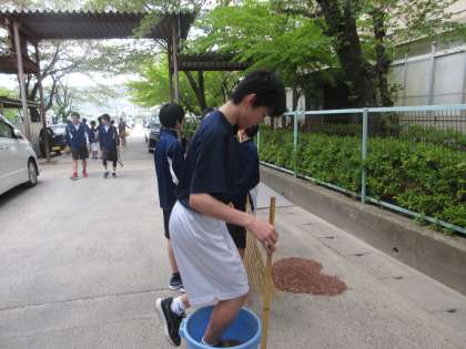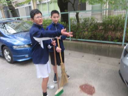 桜も散り、下にがくやおしべの残骸が落ちています。用務員さんがもくもくとほうきを使って集めていると、練習が終わったバスケット部の面々が手伝ってくれたそうです。数日後、用務員さんからその話を聞いて、うれしさのあまり他の先生にその話をしていると、そのとき写真をとりました〜とある先生が声を上げました「写真とってます!」。「そのときには、もう掃除も終わりかけていたそうでもくもくと掃除している写真ではないですが、・・・」と。