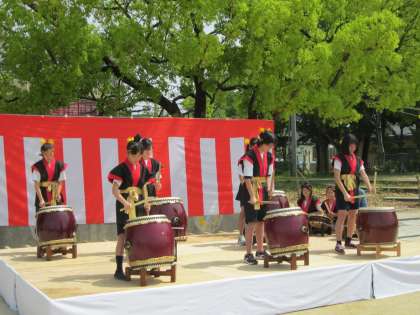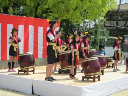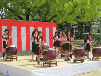 好天に恵まれた南太秦小での三世代春祭りに中学生が出演、祭りを盛り上げていました。