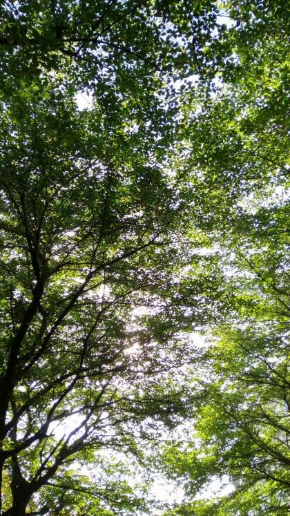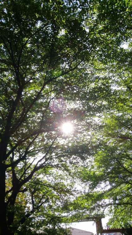 葉と葉の間から太陽が顔をのぞかせています。