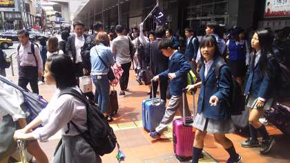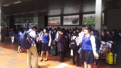 新幹線は博多駅に到着!観光バスに乗り込むまで、整列して待ってます!これから大刀洗に向かいます!
