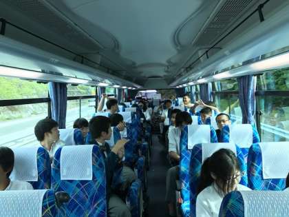 バスレクでは、ビンゴ大会や心理テストで盛り上がっています。もうすぐ目的地の安心院に到着します。