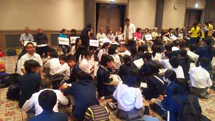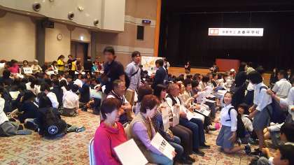 安心院に到着しました!!ホール前でクラス写真を撮った後は、民泊先の方々と対面しました。