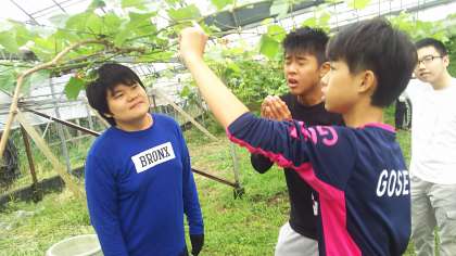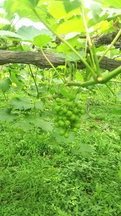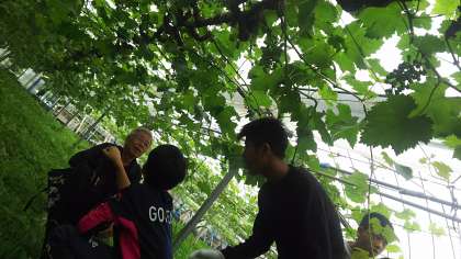 雨の中、ブドウ園ではビニールハウス内で草刈りやブドウの説明を受けていました!!