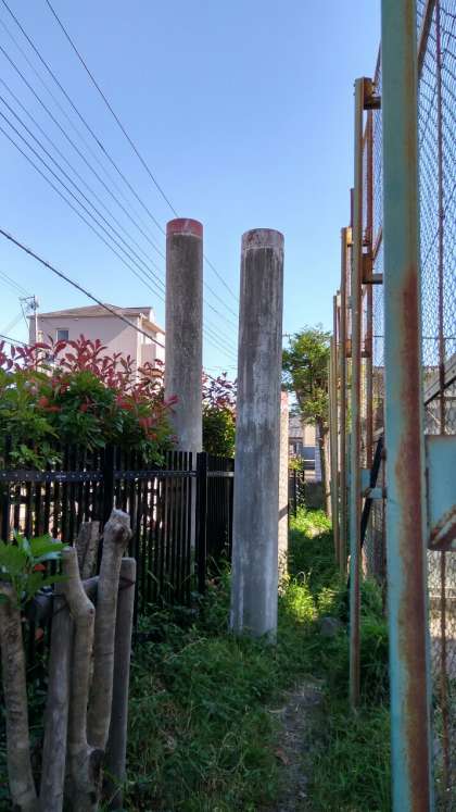 撮影所ゆかりの棒が3本立っている。